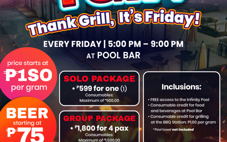 Every Friday from 5PM to 9PM, join us at the Pool Bar of PROXY Plus by The Oriental Pangasinan for a BBQ night packed with smoky flavors, laughter, and good vibes. Savor freshly grilled favorites at just ₱1 per gram, sip your favorite drinks, and soak in the relaxing ambiance that makes Friday nights feel