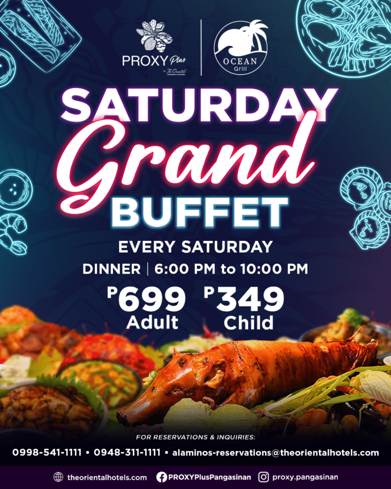 Join us at Ocean Grill, PROXY Plus by The Oriental Pangasinan for a Grand Dinner Buffet thatβs packed with sizzling flavors, fragrant spices, and the ultimate highlight β crispy, crackling lechon.