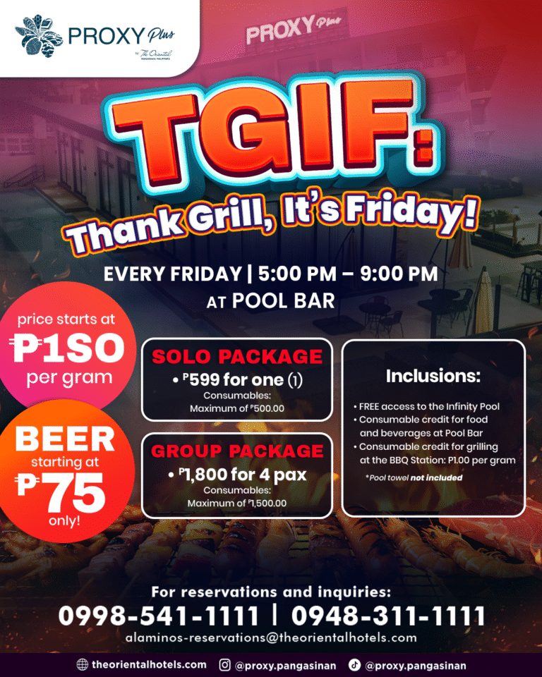 Every Friday from 5PM to 9PM, join us at the Pool Bar of PROXY Plus by The Oriental Pangasinan for a BBQ night packed with smoky flavors, laughter, and good vibes. Savor freshly grilled favorites at just β±1 per gram, sip your favorite drinks, and soak in the relaxing ambiance that makes Friday nights feel extra special.